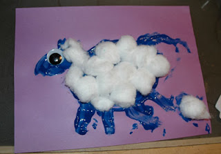 ACTIVITY: This was an easy, cute, and quick art project. We used finger paint because it is nice and thick and works well for holding cotton balls and googly eyes. We took a piece of paper, and I placed a large oval of finger paint in the middle. My son then spread it around, and I helped him "draw" the legs and head. He then stuck the cotton balls over the sheep and added the eye.